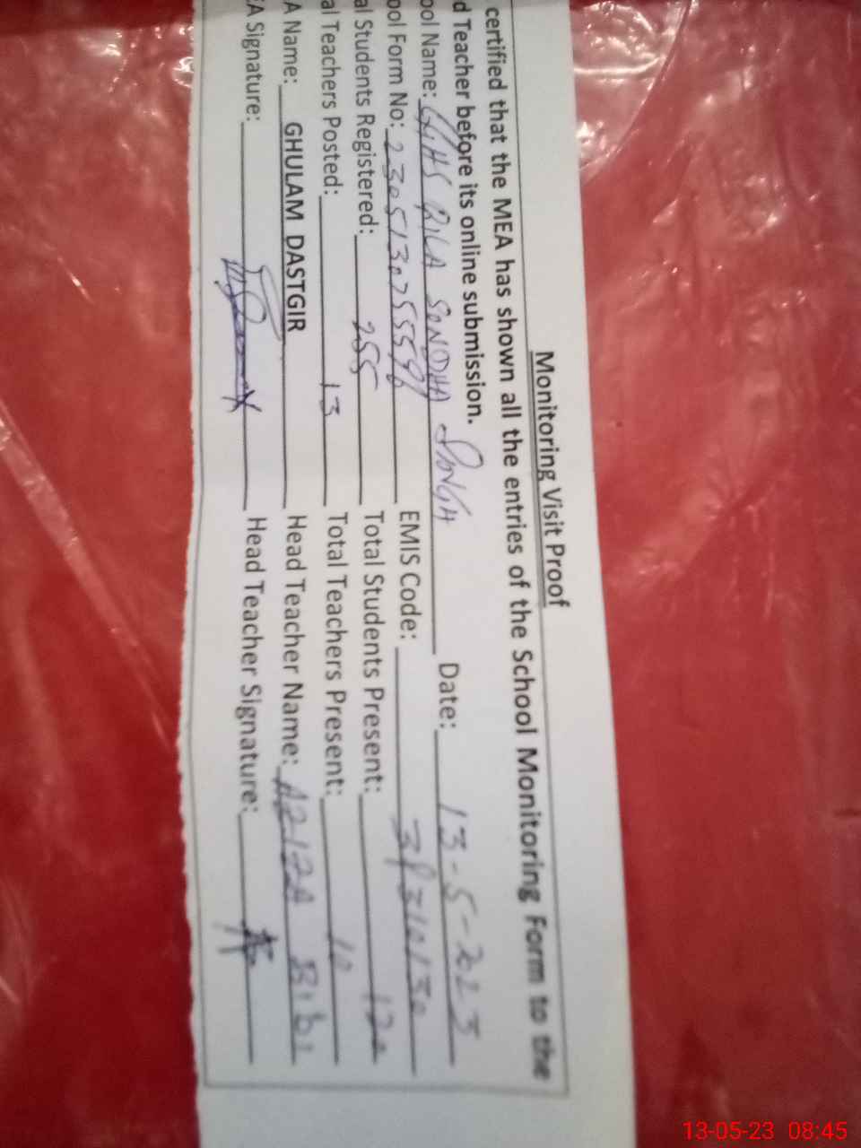 | Attendance Register | Head Teacher | MEA with School | Visit Proof |