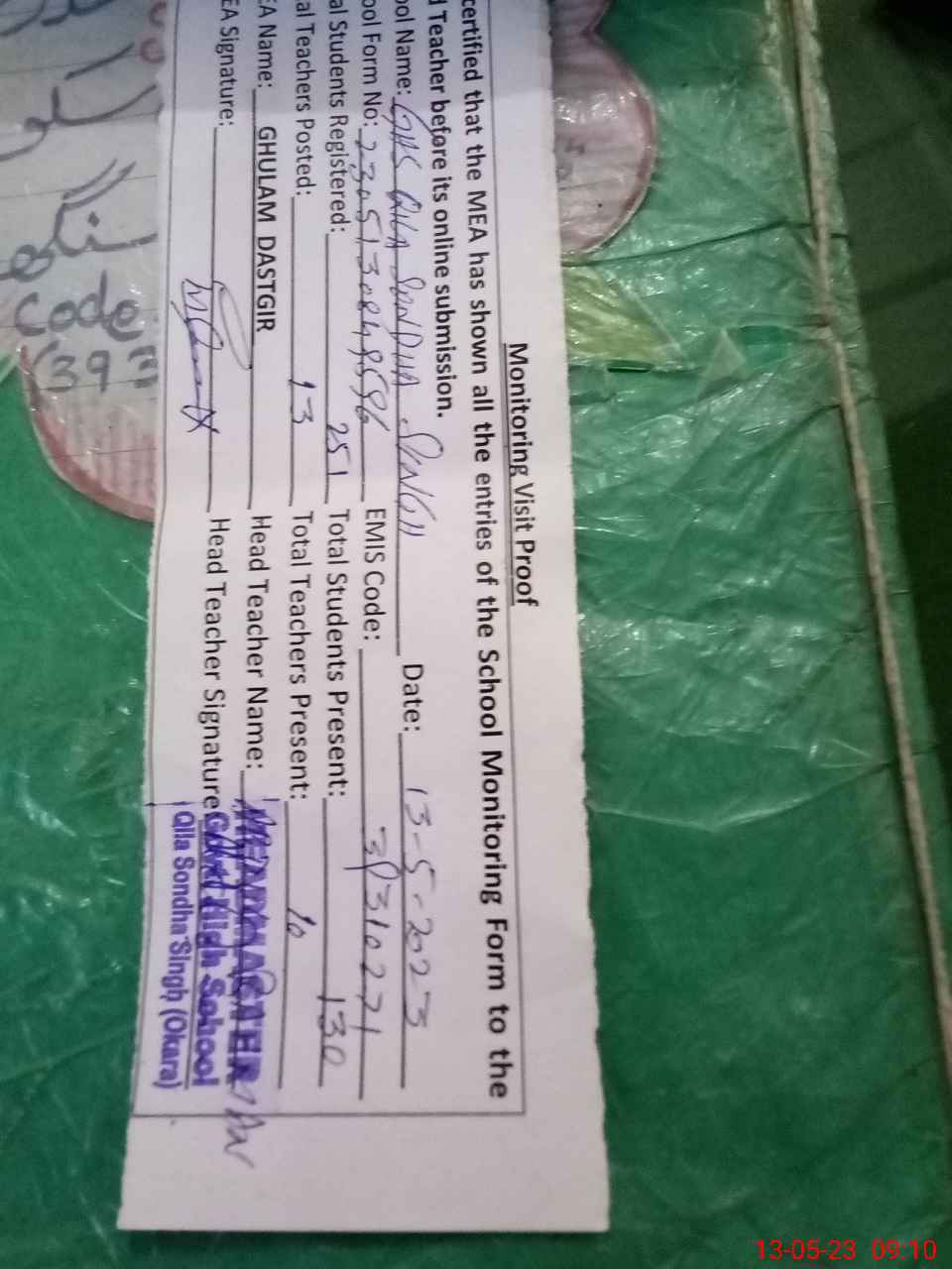 | Attendance Register | Head Teacher | MEA with School | Visit Proof |