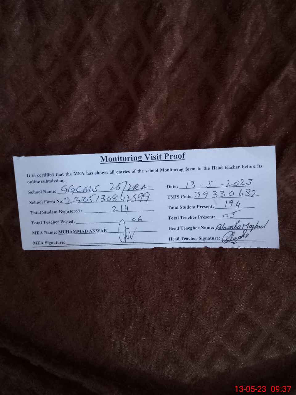 | Attendance Register | Head Teacher | MEA with School | Visit Proof |