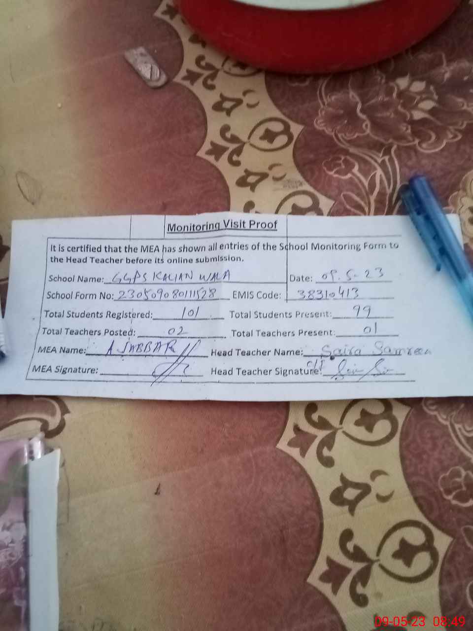 | Attendance Register | Head Teacher | MEA with School | Visit Proof |