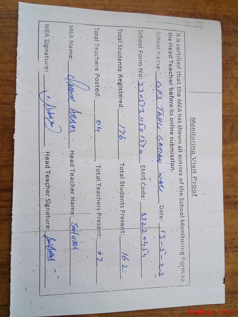 | Attendance Register | Head Teacher | MEA with School | Visit Proof |