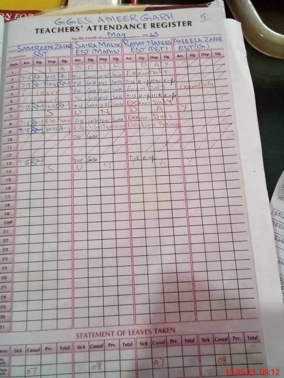 | Remarks (Use Separate Page if Required): EST GEN ANEELA ZAFAR IS ABSENT TODAY CNIC 3610218377312 | |||||