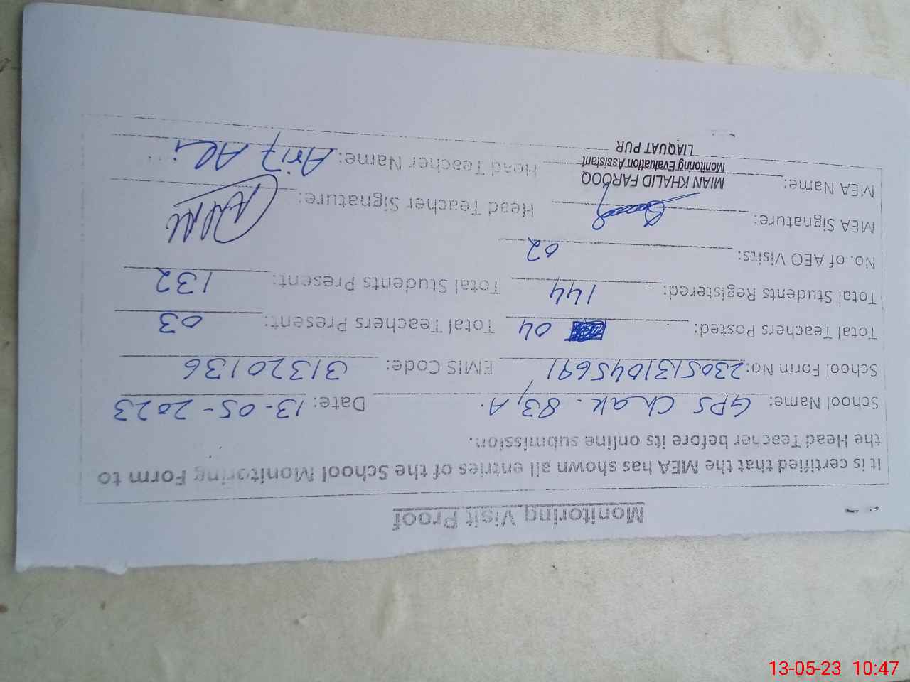| Attendance Register | Head Teacher | MEA with School | Visit Proof |