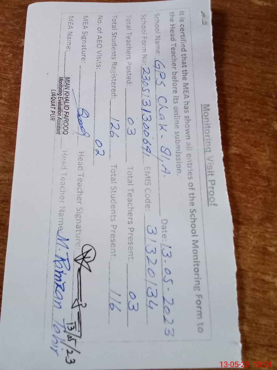 | Attendance Register | Head Teacher | MEA with School | Visit Proof |