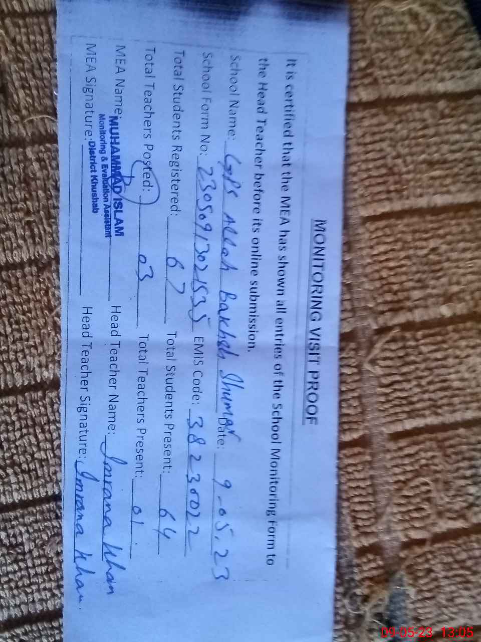 | Attendance Register | Head Teacher | MEA with School | Visit Proof |