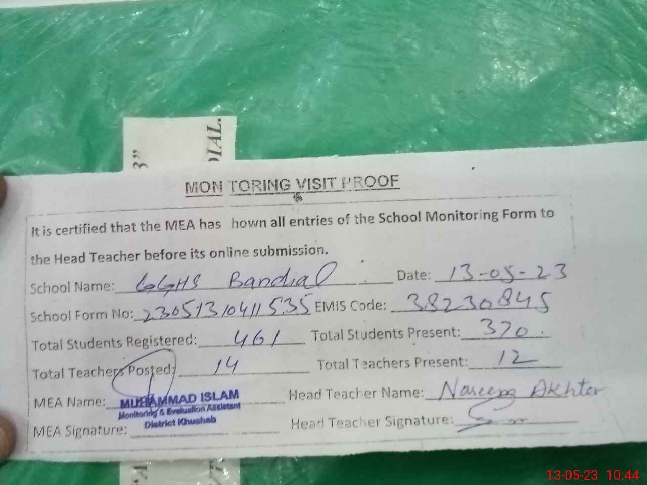| Attendance Register | Head Teacher | MEA with School | Visit Proof |