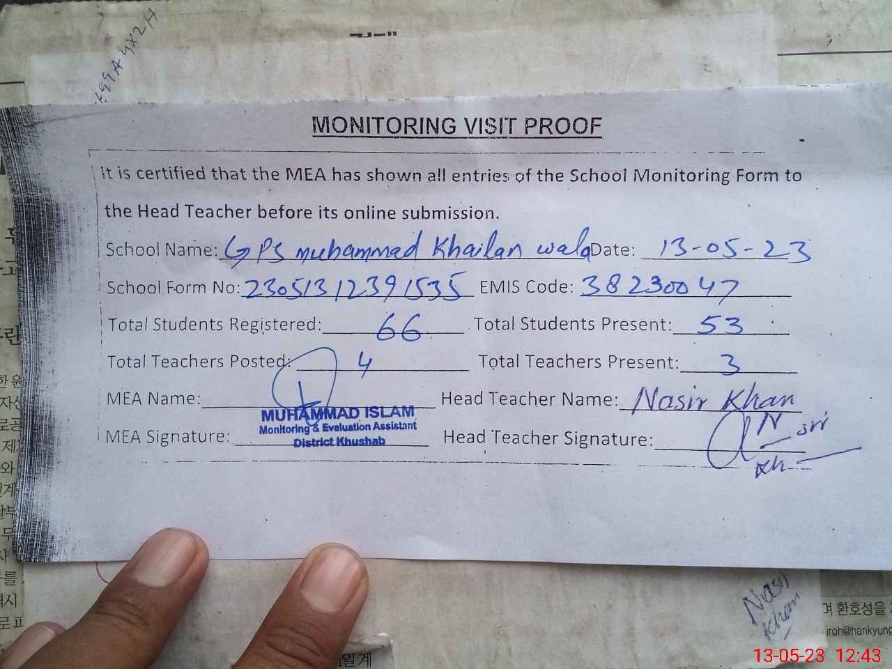 | EMIS Code: 38230047 | Name of School: GPS MUHAMMAD KHAILAN WALA BANDIAL | |||