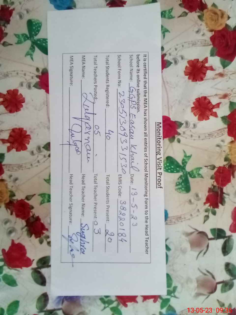 | Attendance Register | Head Teacher | MEA with School | Visit Proof |