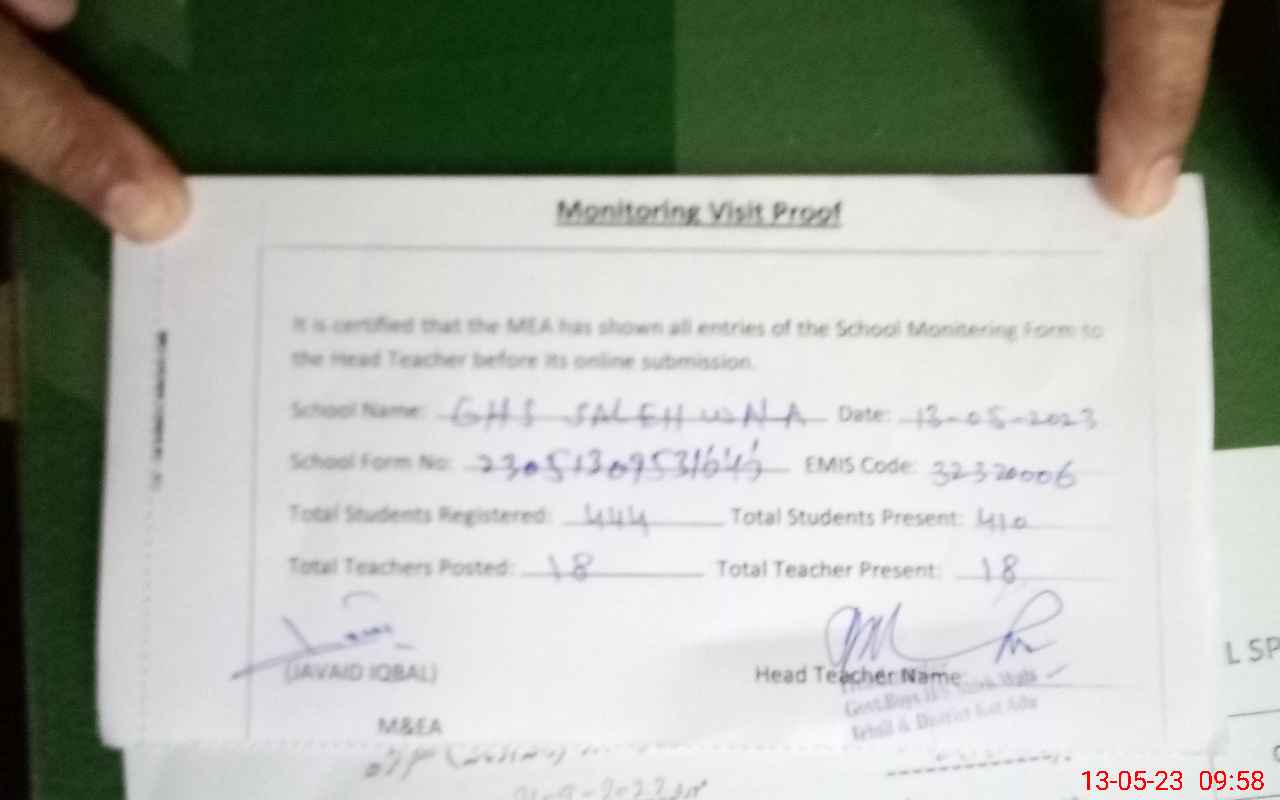 | EMIS Code: 32320006 | Name of School: GHS SALEH WALA | |||