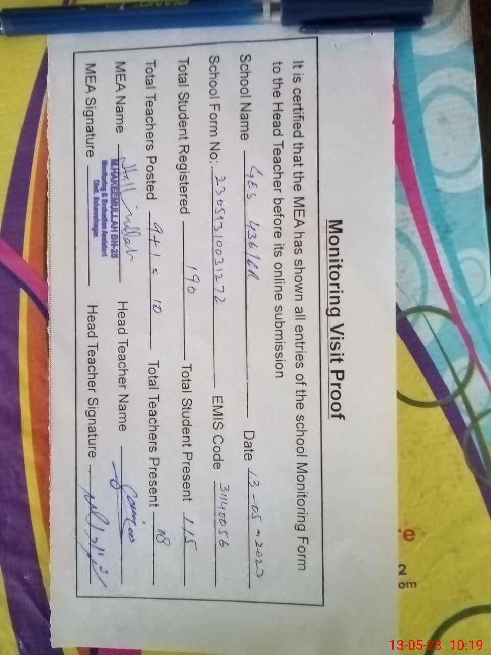 | Attendance Register | Head Teacher | MEA with School | Visit Proof |