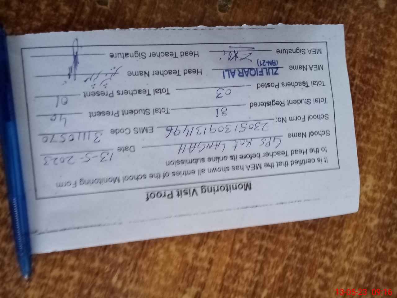 | Monitoring Date: 13-05-2023 | Start Time: 13-05-2023 09:02 AM | End Time: 13-05-2023 09:17 AM | Name of MEA: Zu**** Al**** BN**** | |