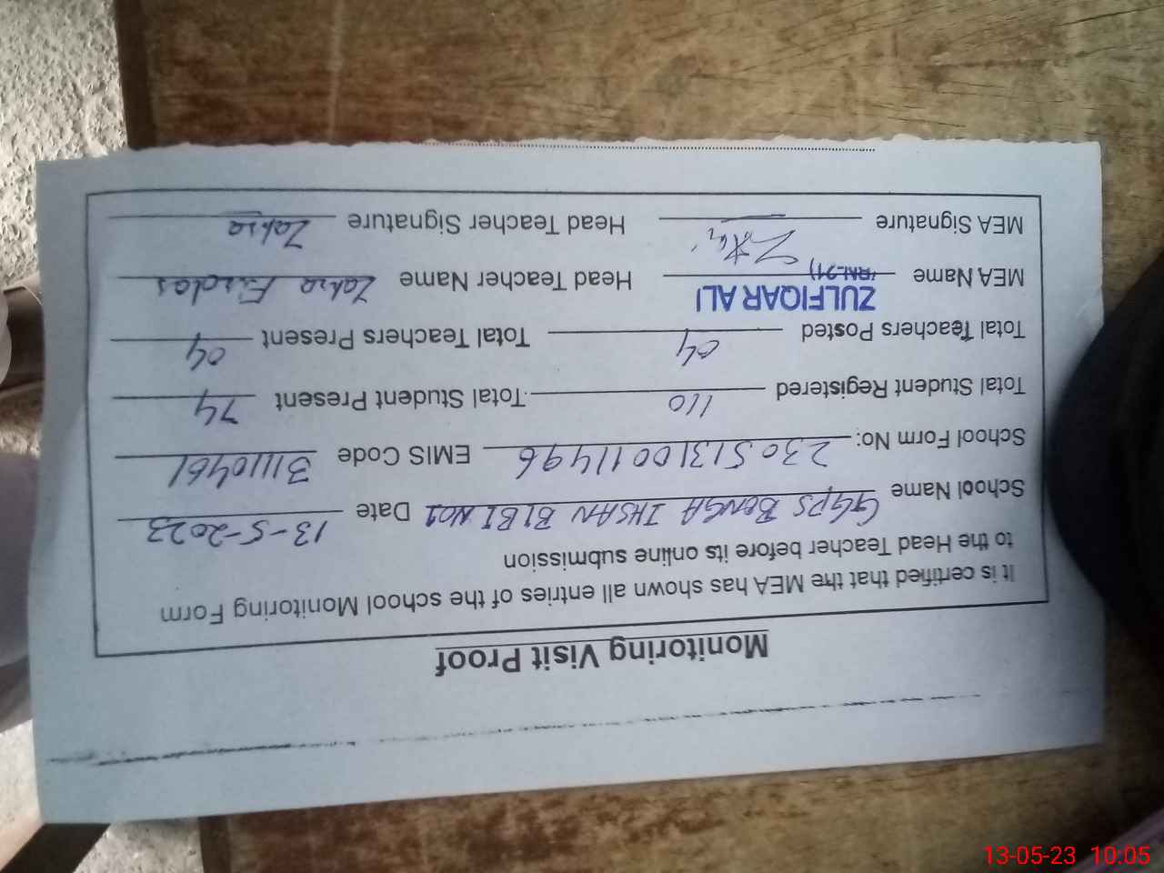 | Name: ZA**** FI**** Designation: (School Headmaster's/Headmistress's) PST Phone/Cell Number: 03**** |