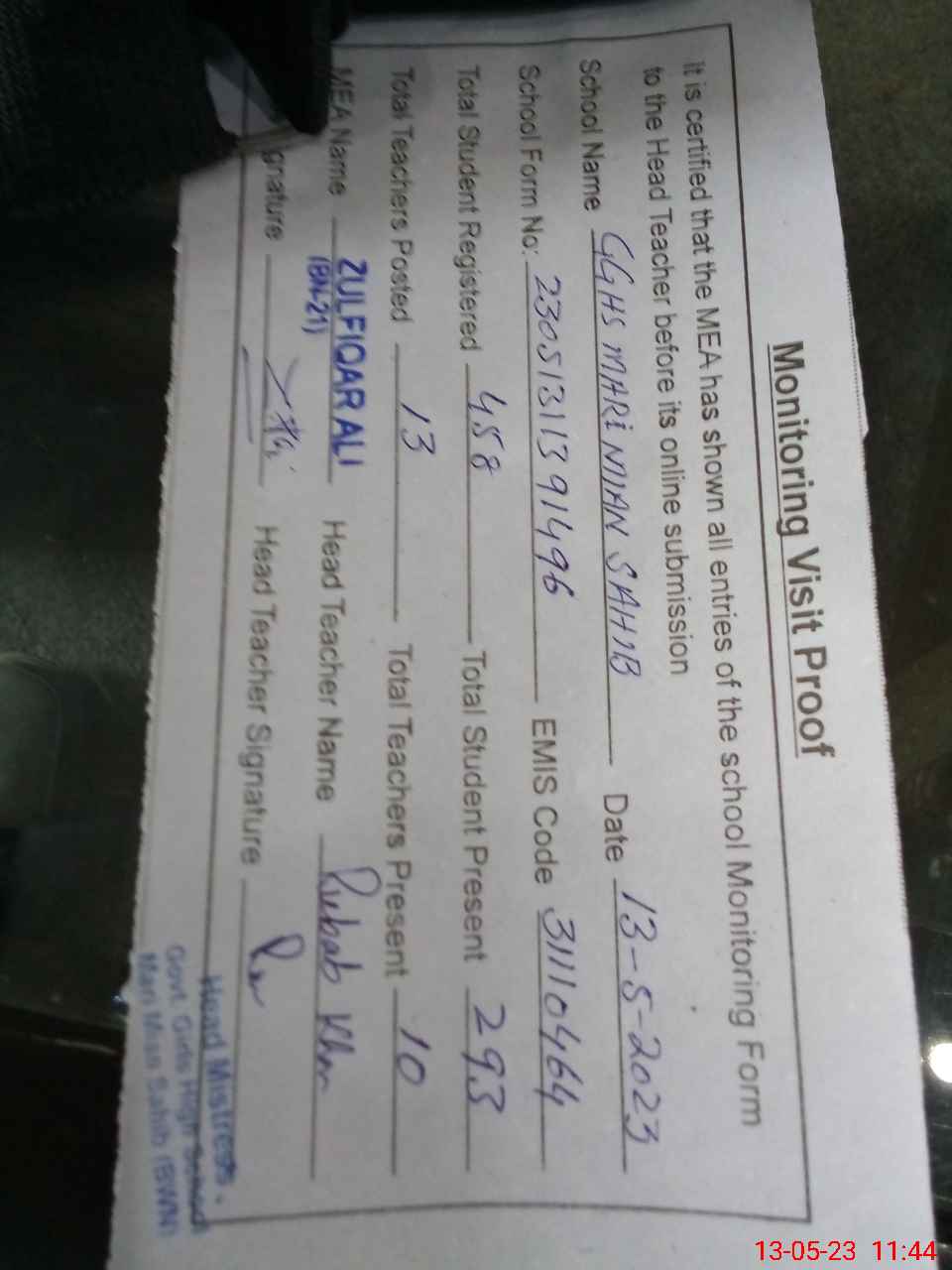| Attendance Register | Head Teacher | MEA with School | Visit Proof |
