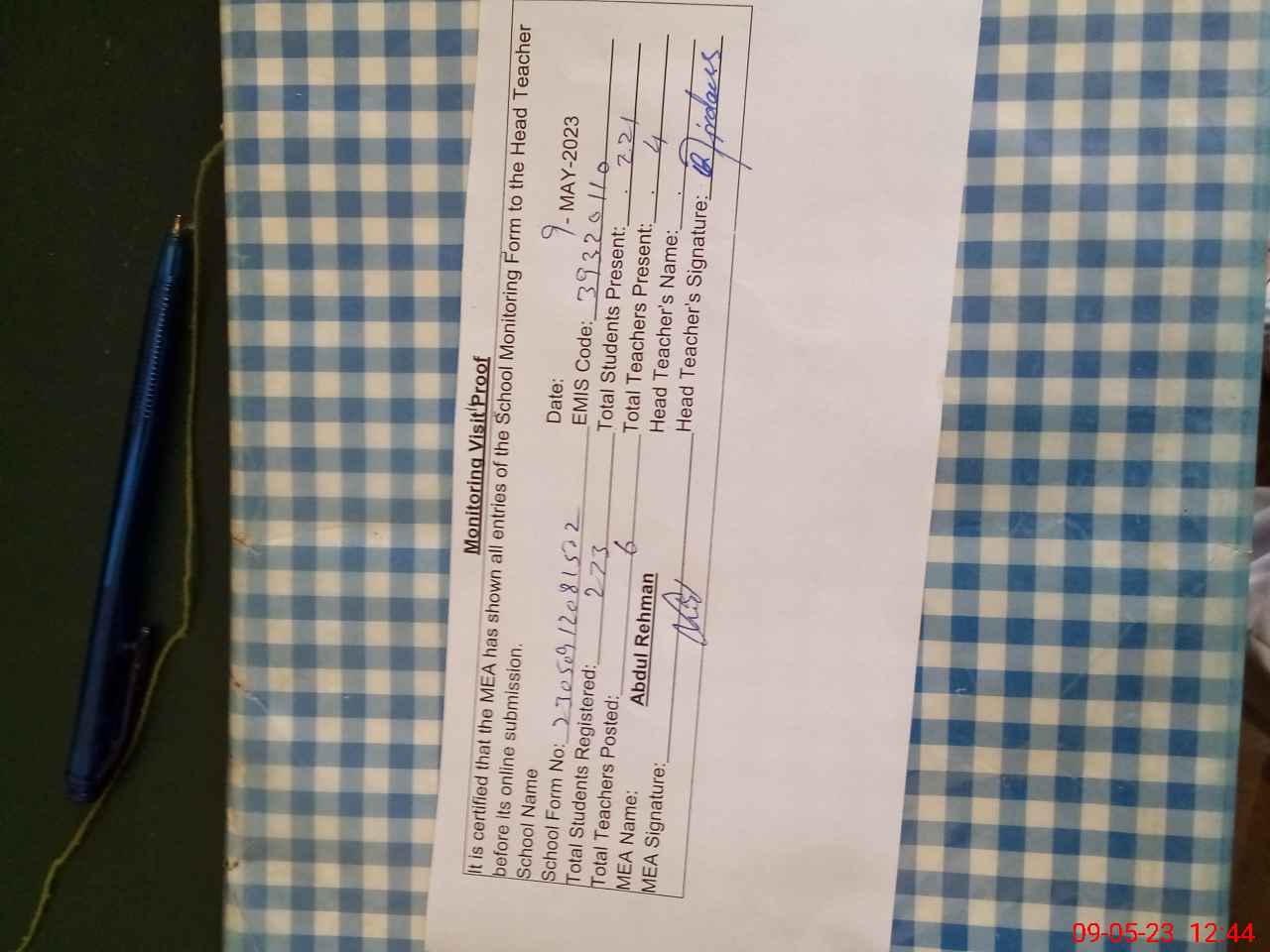| Attendance Register | Head Teacher | MEA with School | Visit Proof |