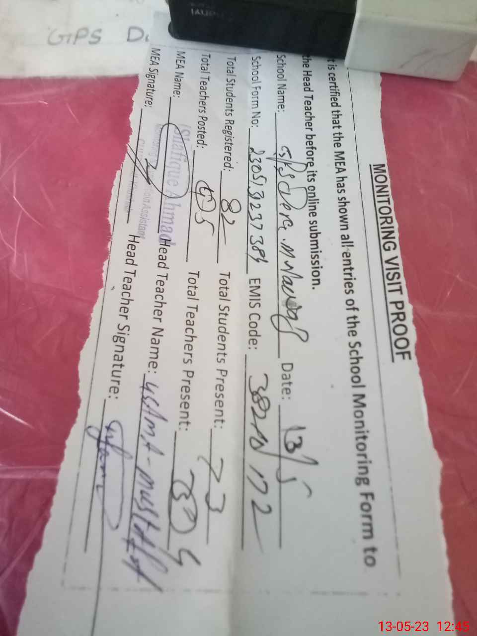 | Attendance Register | Head Teacher | MEA with School | Visit Proof |