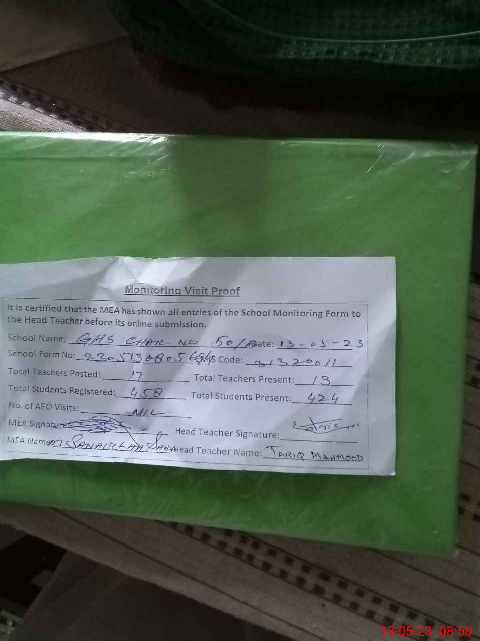 | Attendance Register | Head Teacher | MEA with School | Visit Proof |