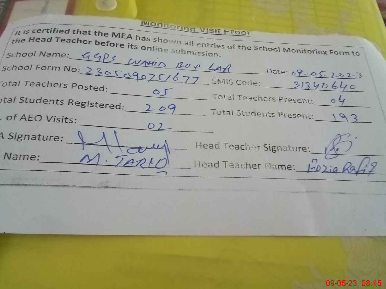 | Attendance Register | Head Teacher | MEA with School | Visit Proof |