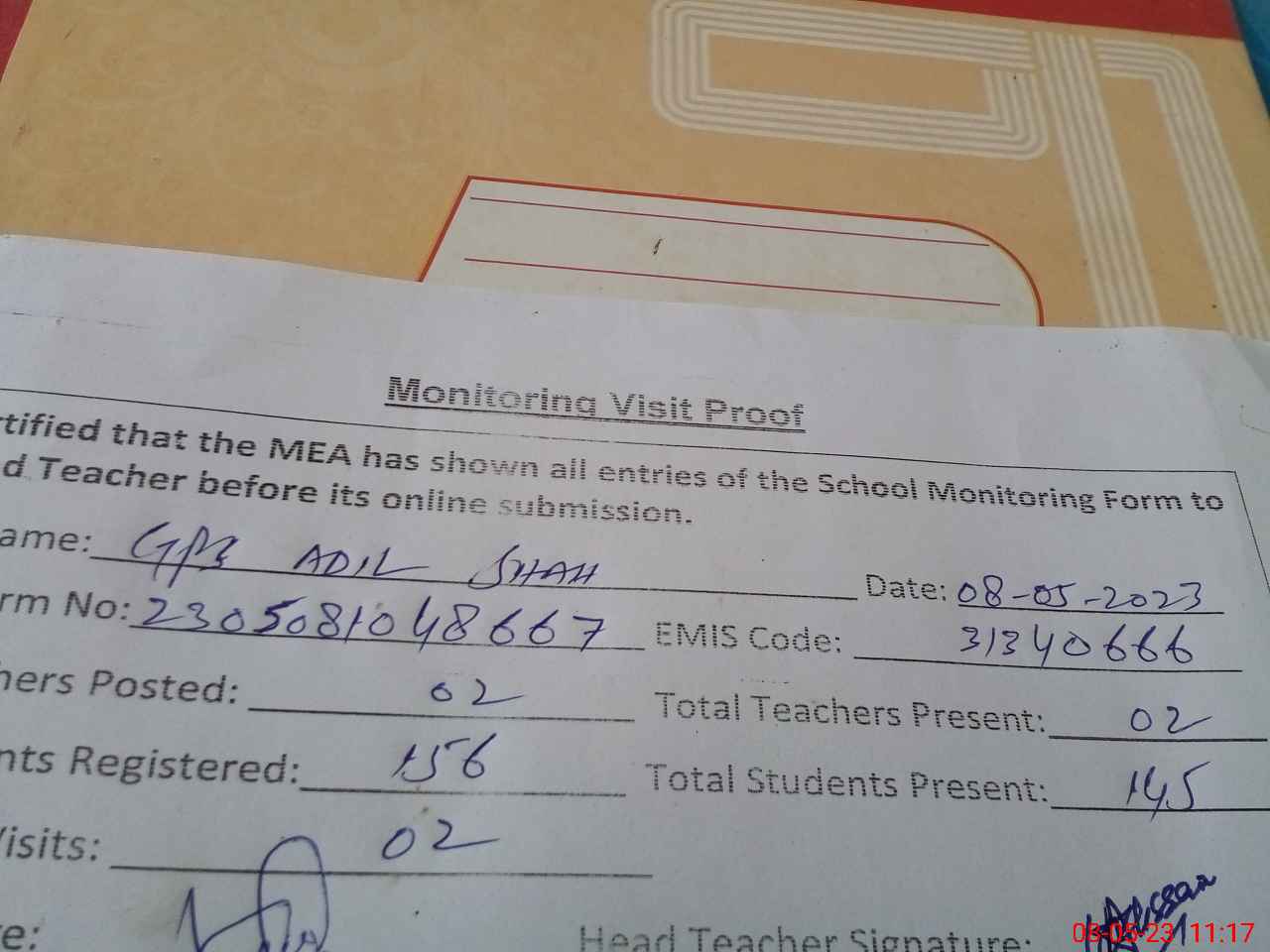 | Attendance Register | Head Teacher | MEA with School | Visit Proof |