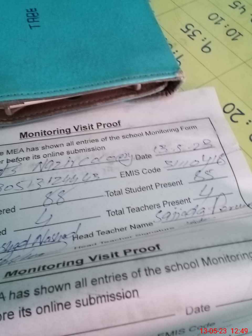 | Attendance Register | Head Teacher | MEA with School | Visit Proof |