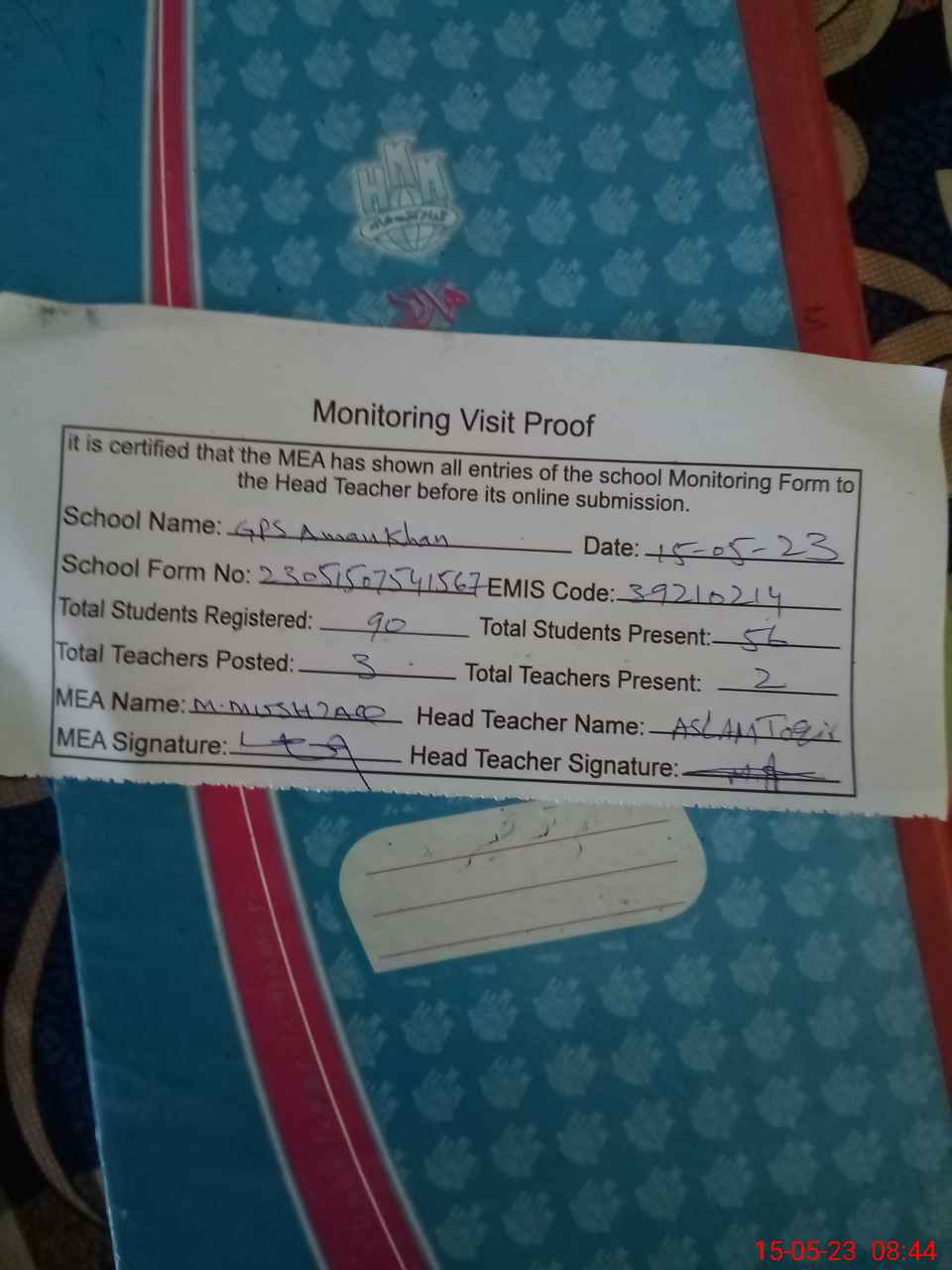 | Attendance Register | Head Teacher | MEA with School | Visit Proof |
