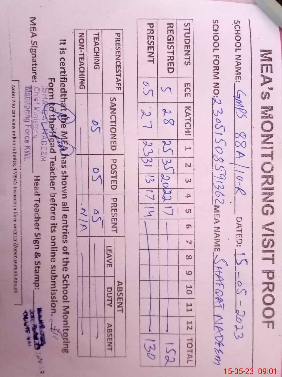 | Attendance Register | Head Teacher | MEA with School | Visit Proof |