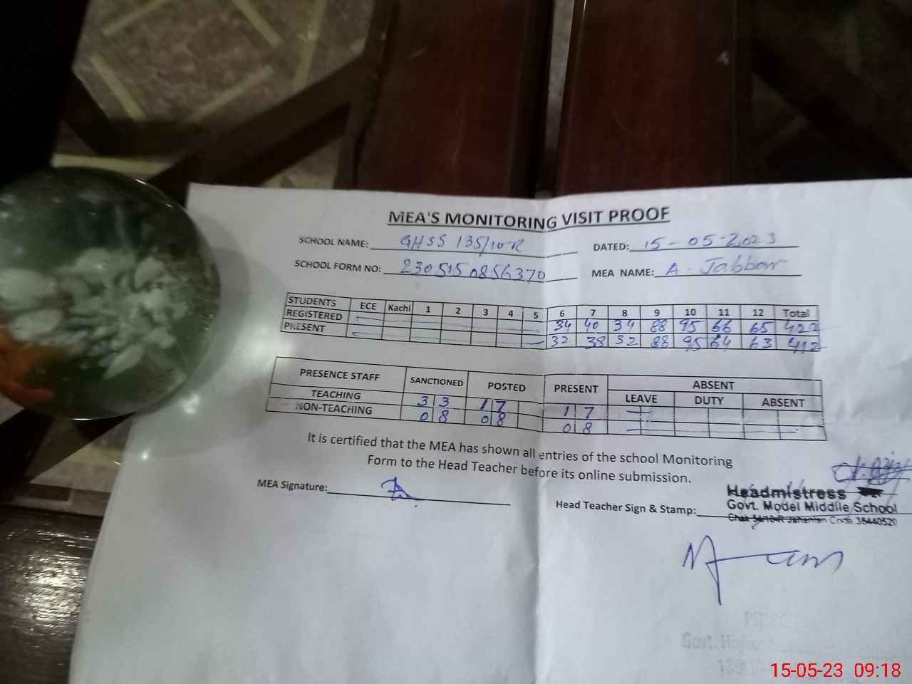| Attendance Register | Head Teacher | MEA with School | Visit Proof |