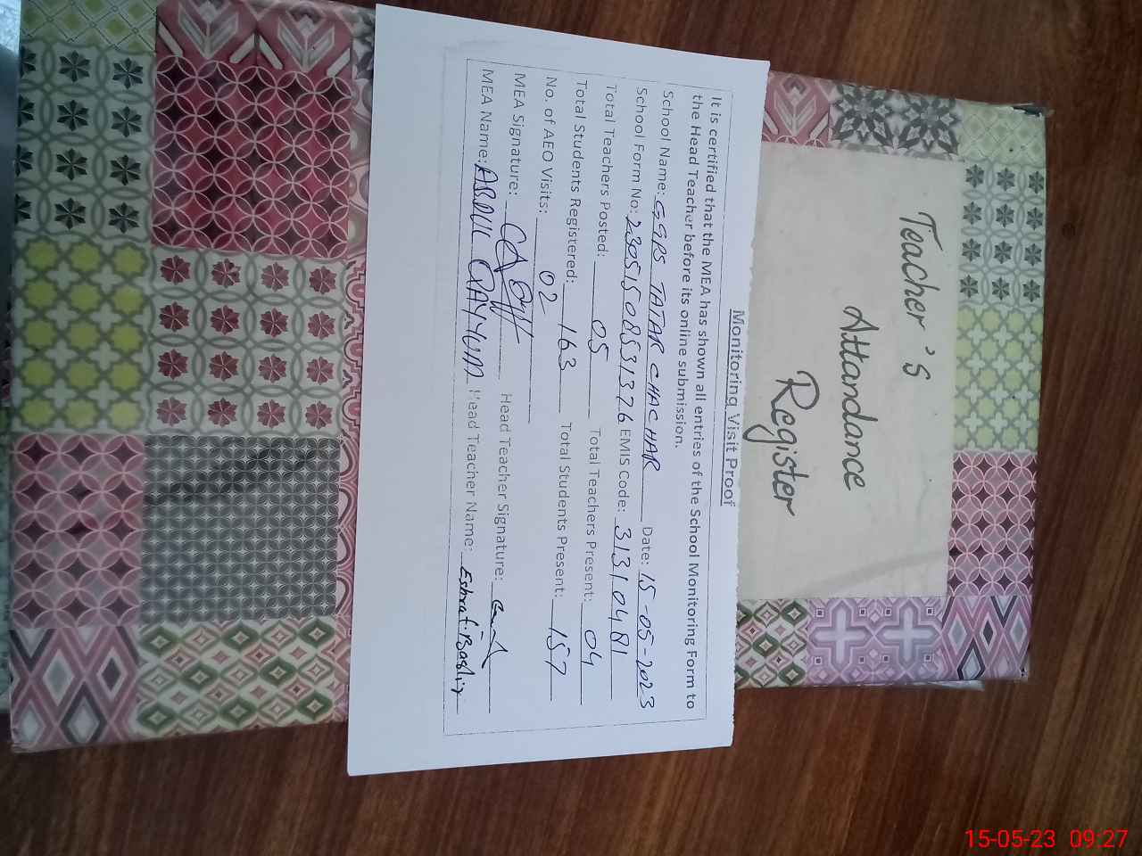 | Attendance Register | Head Teacher | MEA with School | Visit Proof |