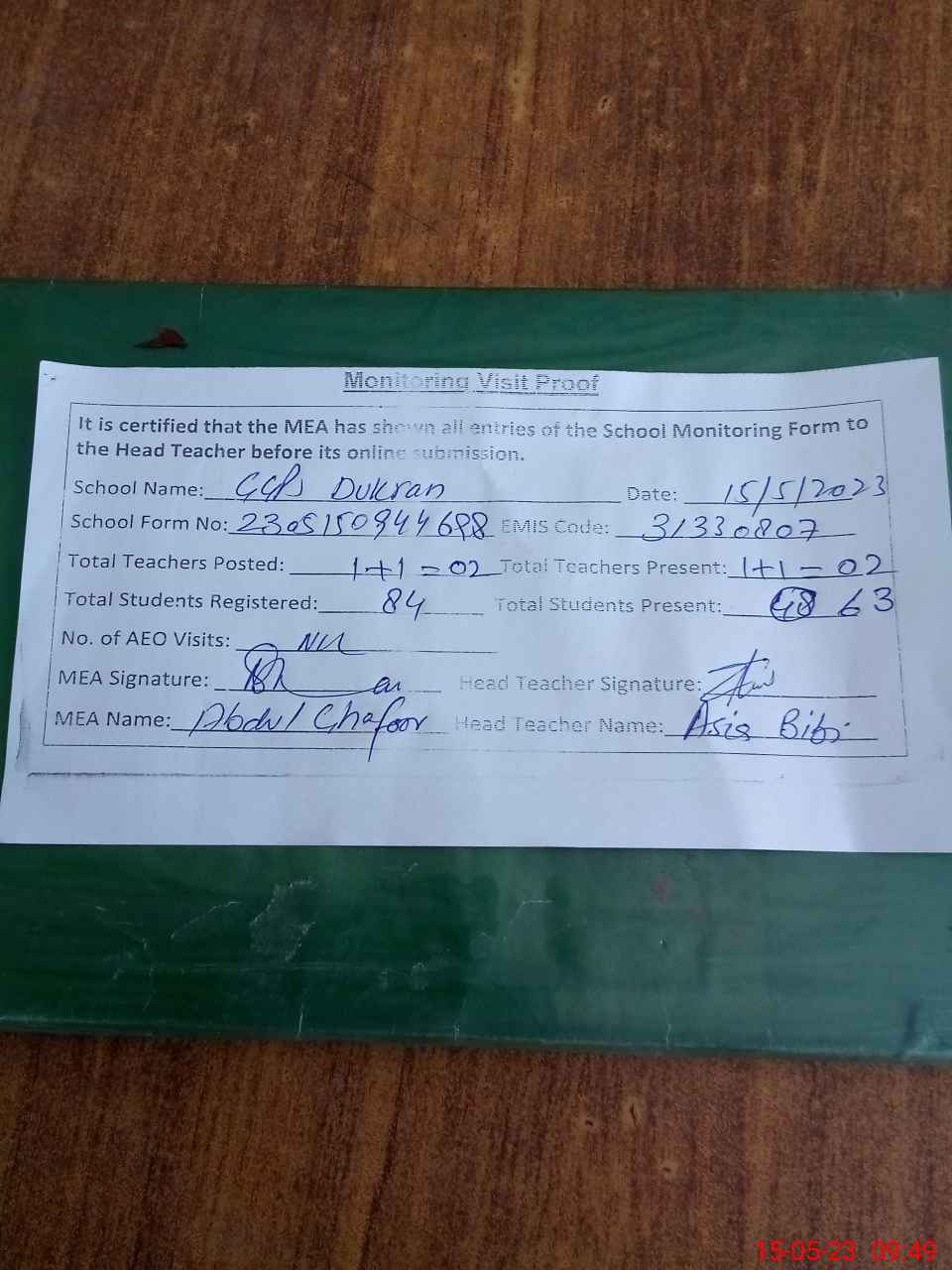 | Attendance Register | Head Teacher | MEA with School | Visit Proof |