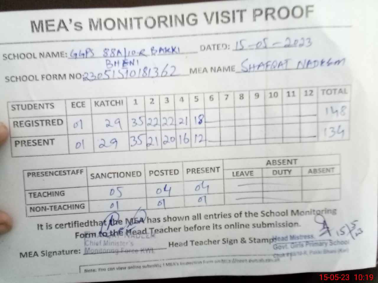 | Attendance Register | Head Teacher | MEA with School | Visit Proof |
