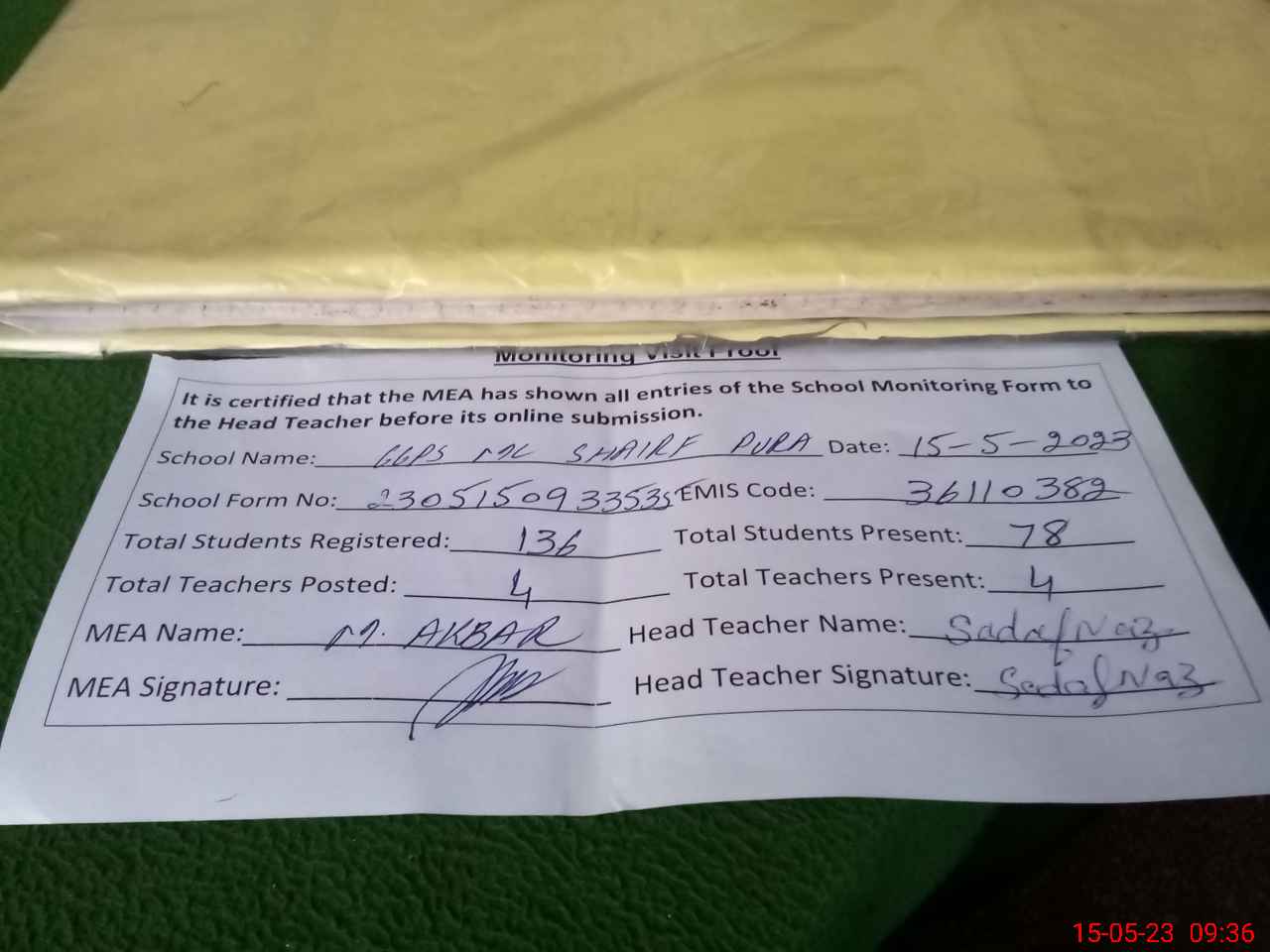 | Attendance Register | Head Teacher | MEA with School | Visit Proof |