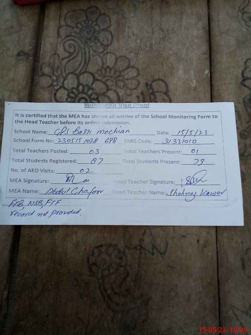 | Attendance Register | Head Teacher | MEA with School | Visit Proof |
