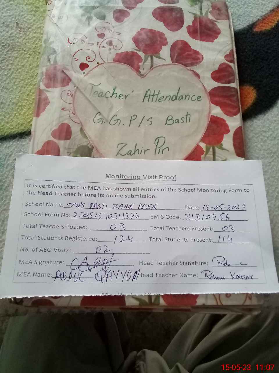 | Attendance Register | Head Teacher | MEA with School | Visit Proof |