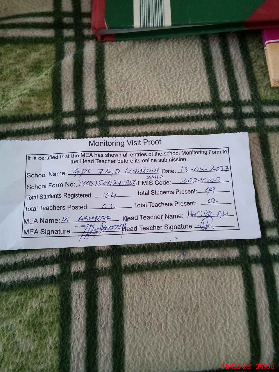 | Attendance Register | Head Teacher | MEA with School | Visit Proof |