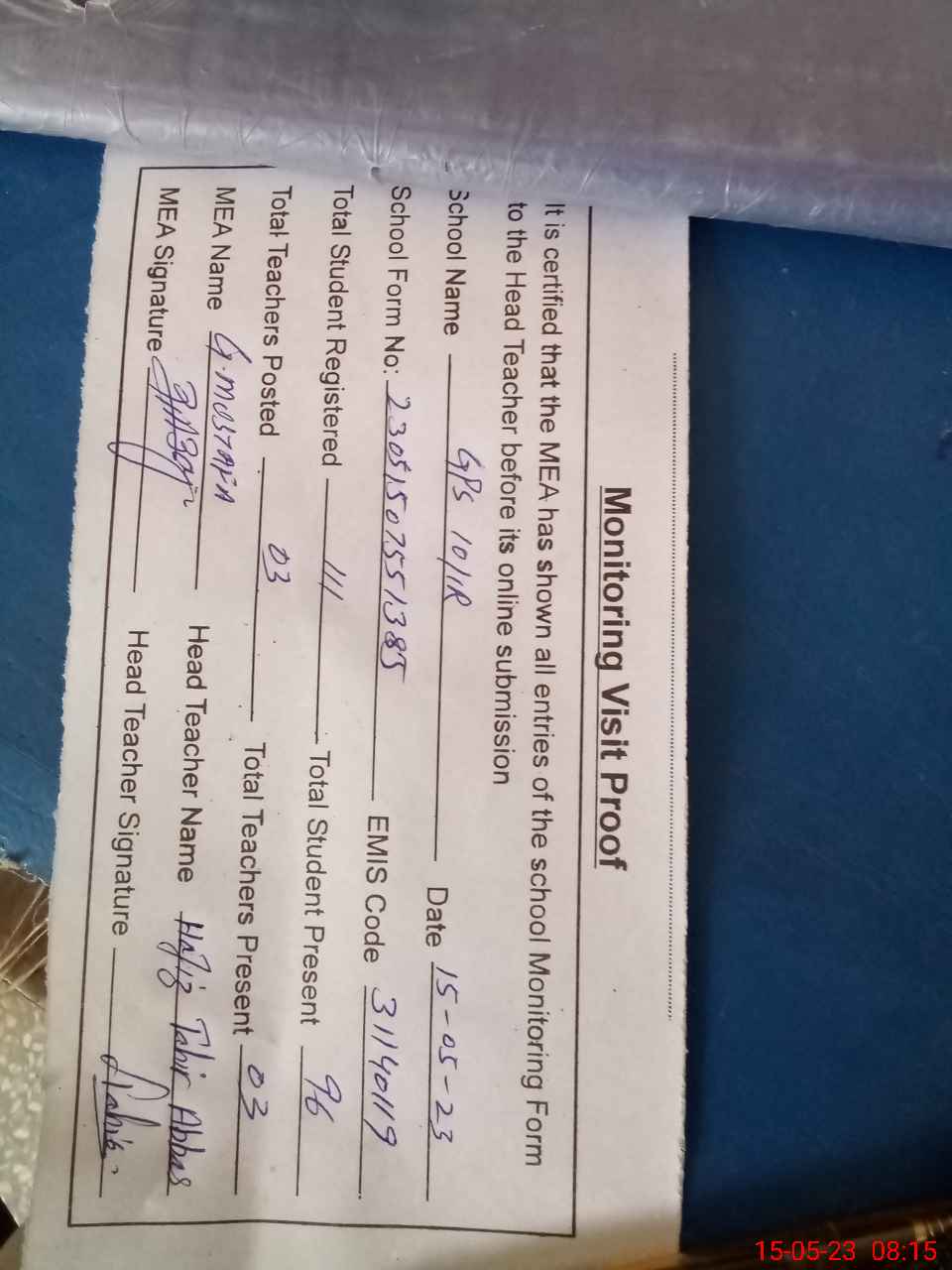 | Attendance Register | Head Teacher | MEA with School | Visit Proof |
