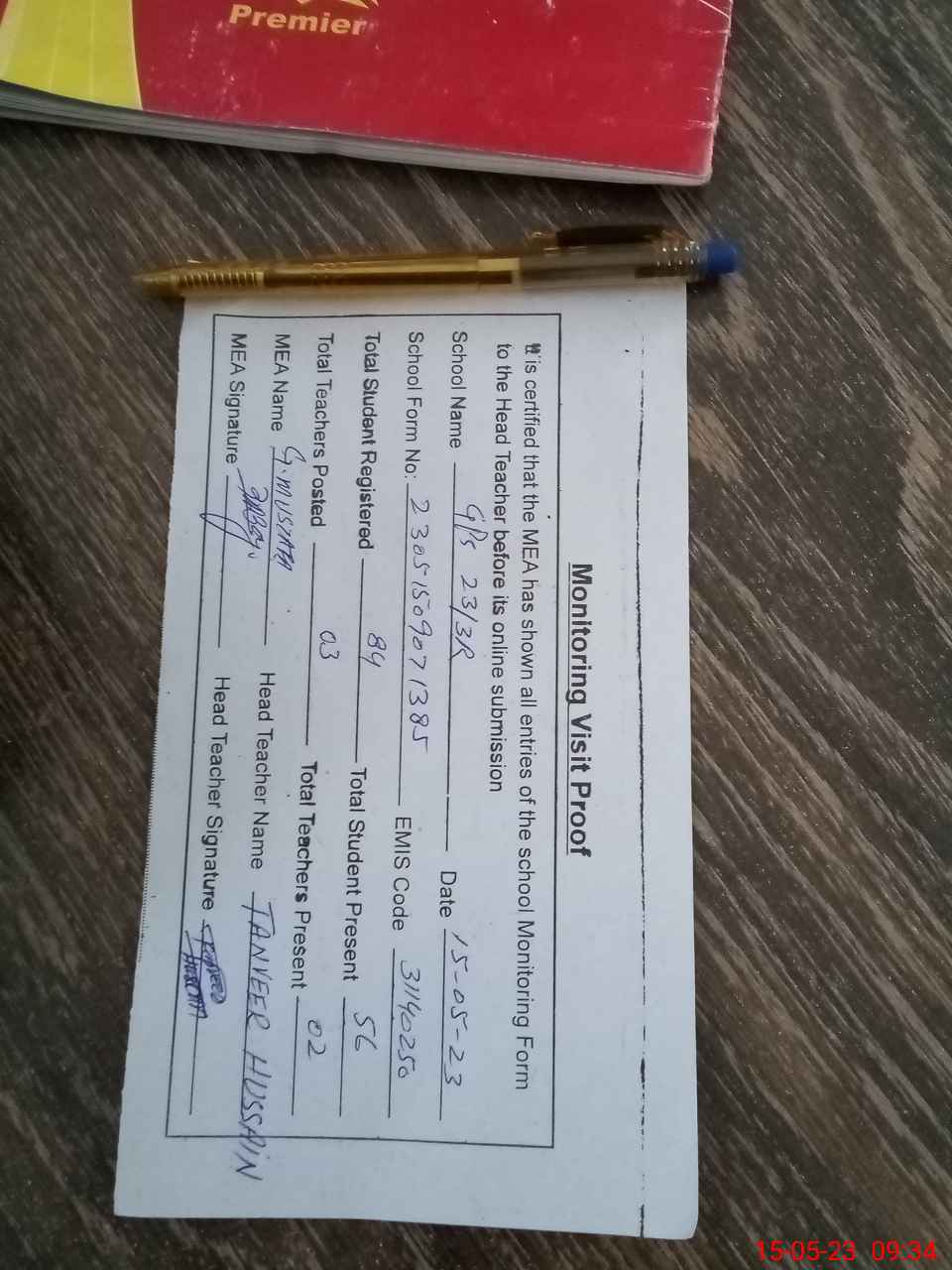 | Attendance Register | Head Teacher | MEA with School | Visit Proof |