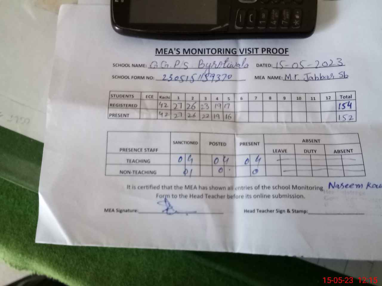 | Attendance Register | Head Teacher | MEA with School | Visit Proof |