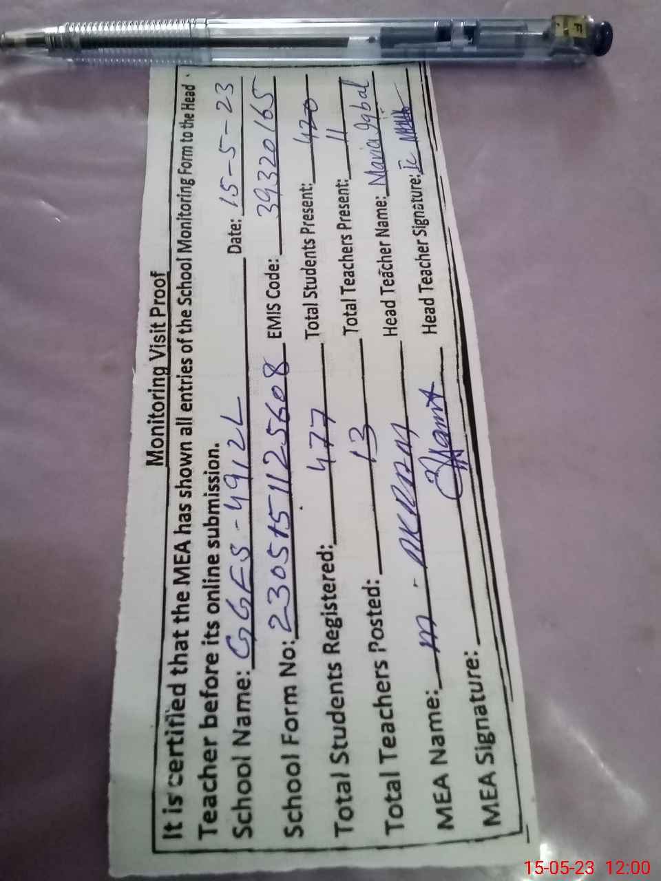 | Attendance Register | Head Teacher | MEA with School | Visit Proof |