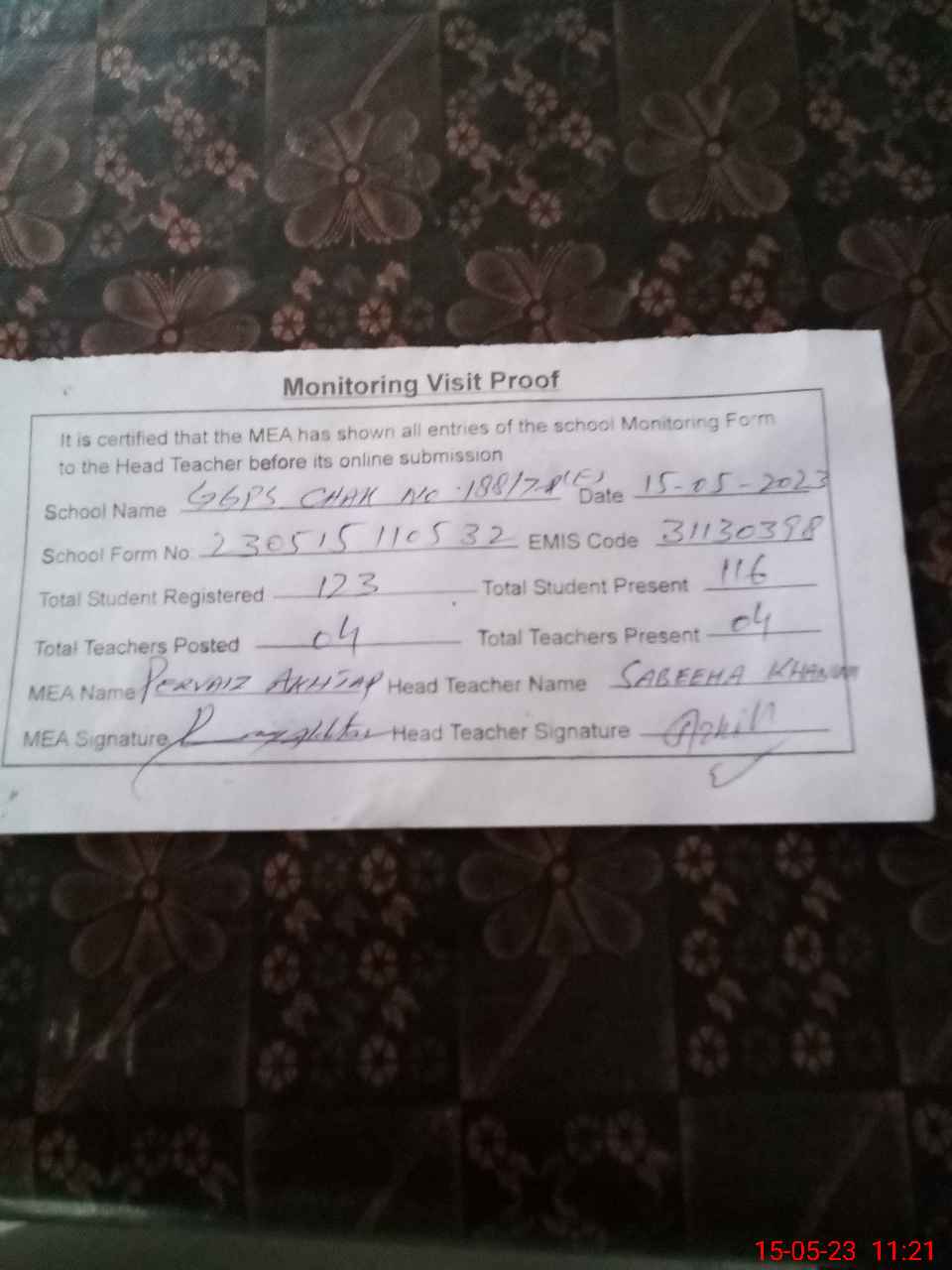| Attendance Register | Head Teacher | MEA with School | Visit Proof |