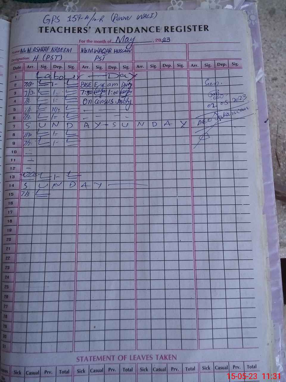 | Name: M.AS**** Designation: (School Headmaster's/Headmistress's) PST Phone/Cell Number: 03**** |
