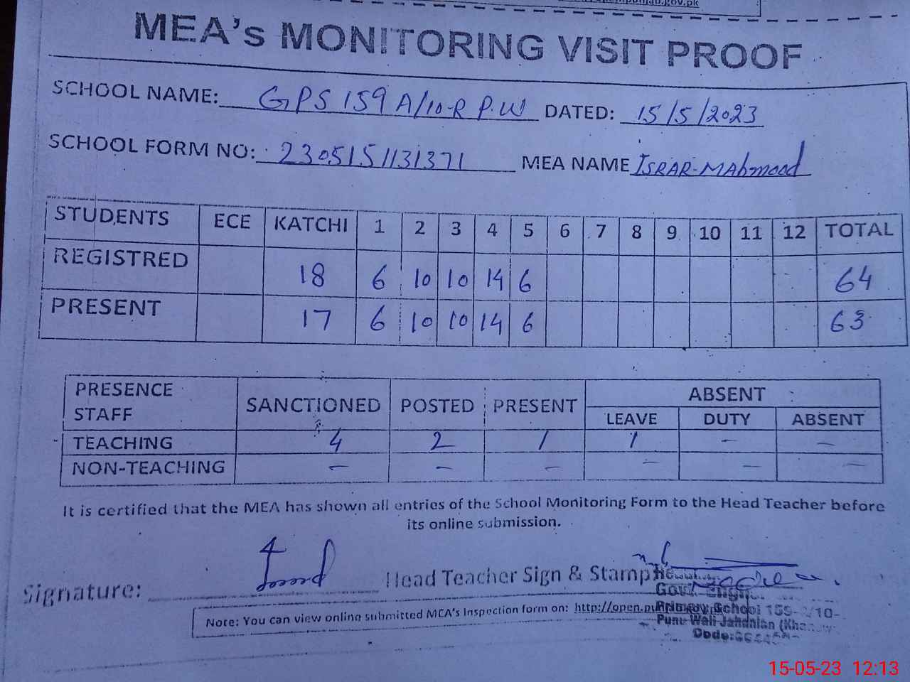 | Attendance Register | Head Teacher | MEA with School | Visit Proof |