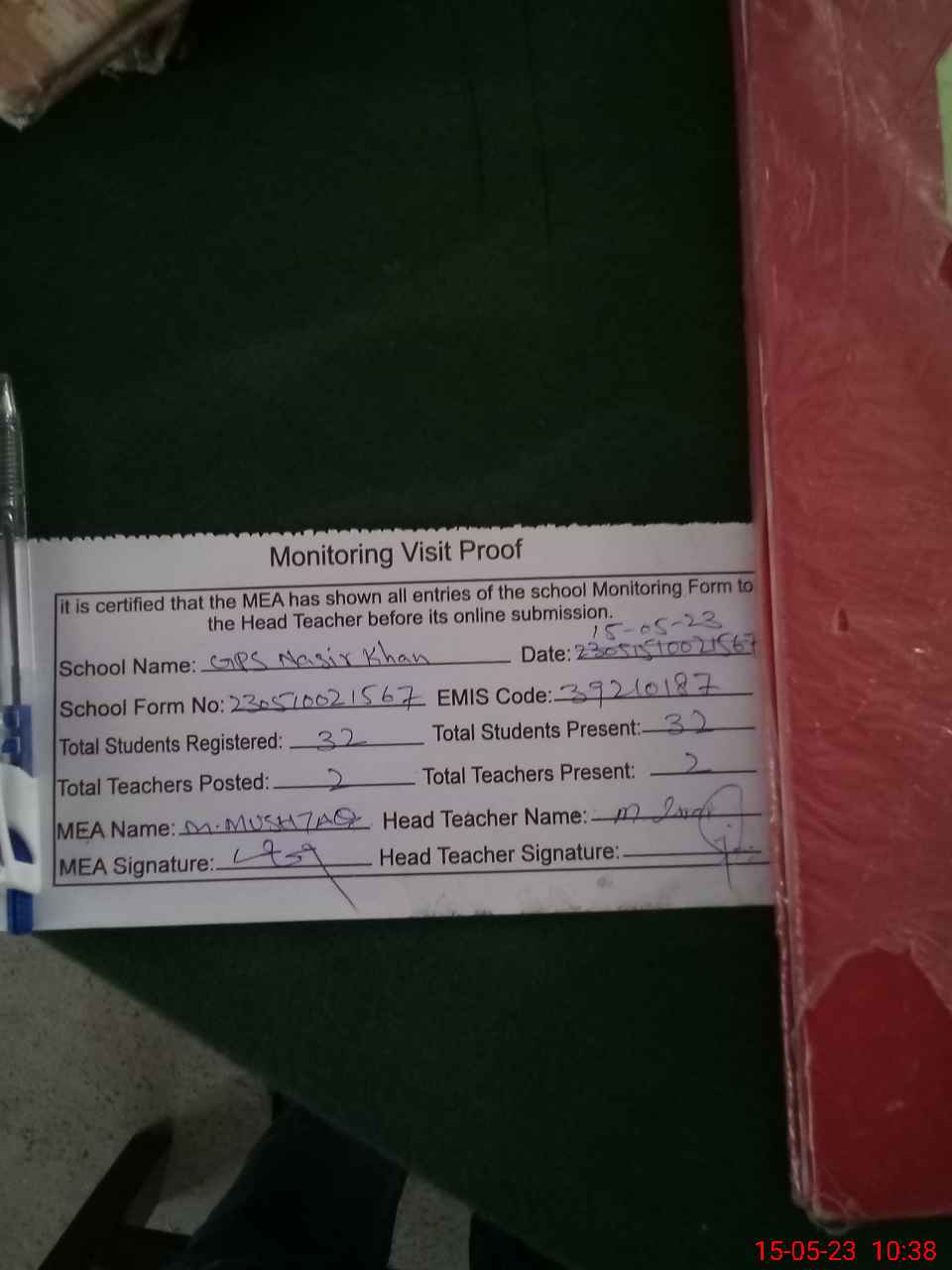 | Attendance Register | Head Teacher | MEA with School | Visit Proof |