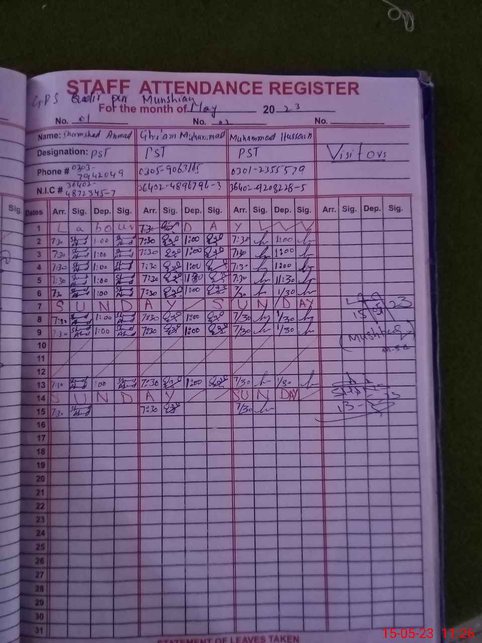 | CNIC | Full Name | Designation | R/C | Absence During Last Calender Month |