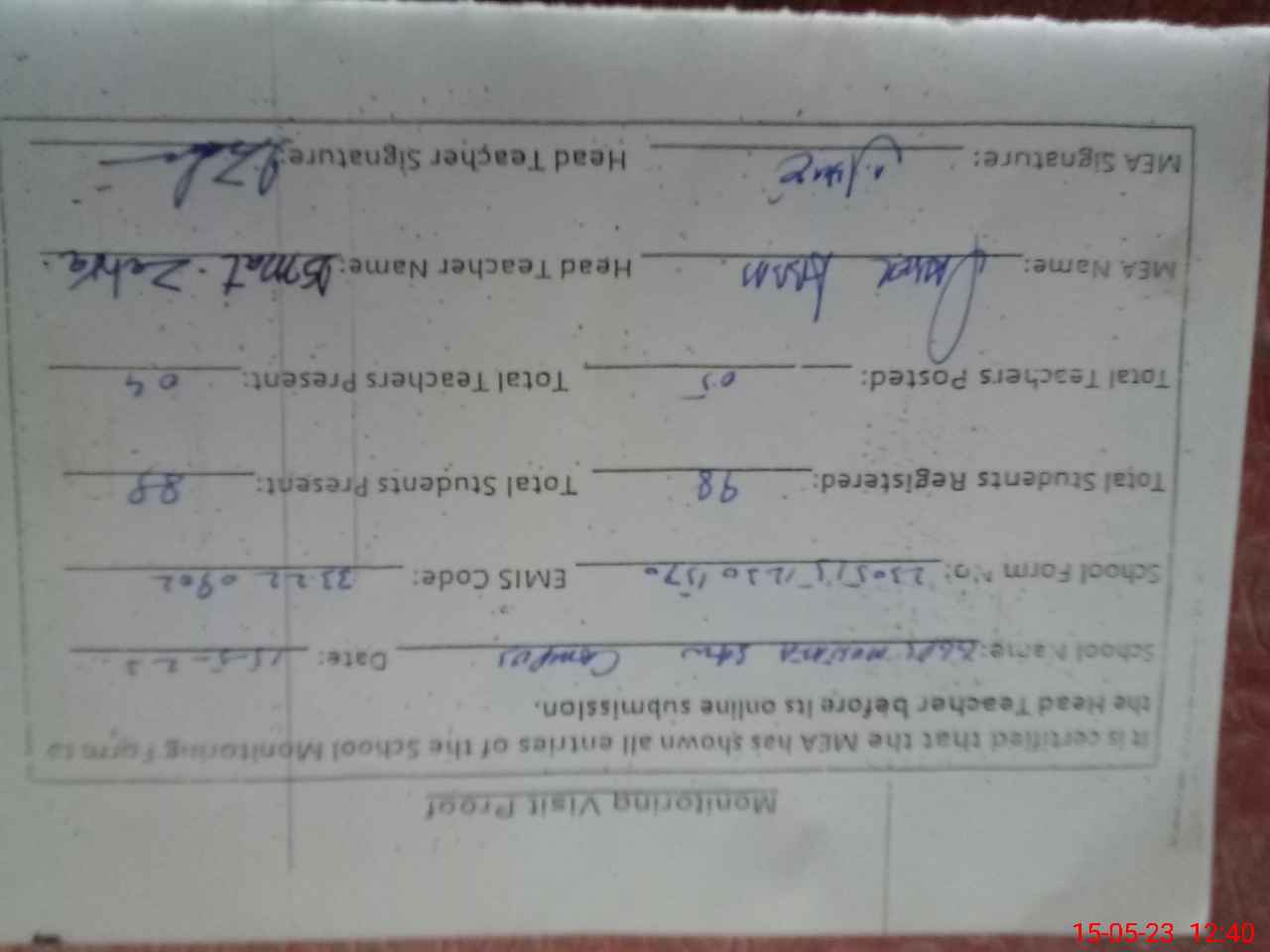 | Attendance Register | Head Teacher | MEA with School | Visit Proof |