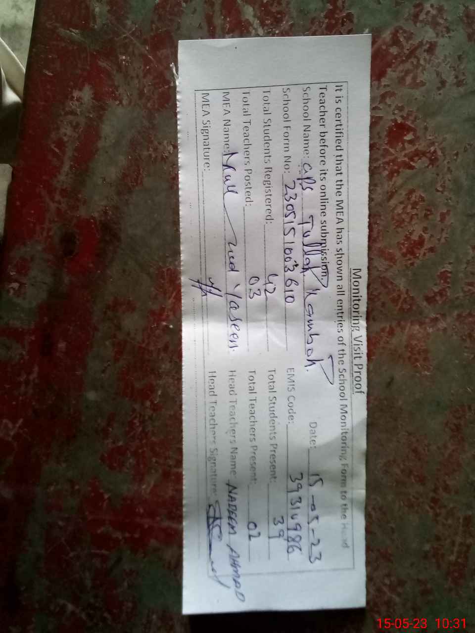 | Attendance Register | Head Teacher | MEA with School | Visit Proof |