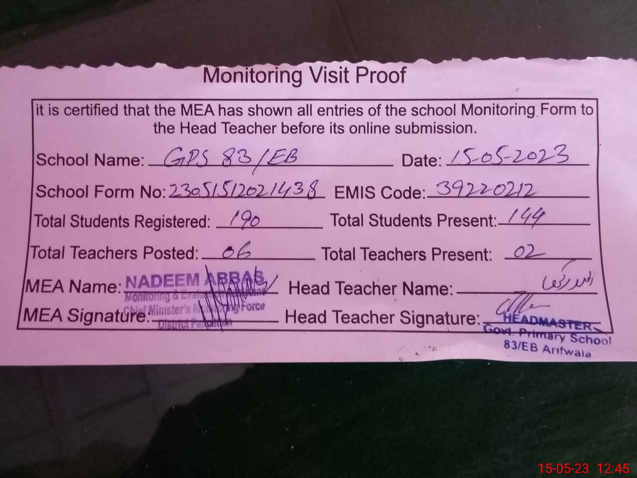 | Attendance Register | Head Teacher | MEA with School | Visit Proof |