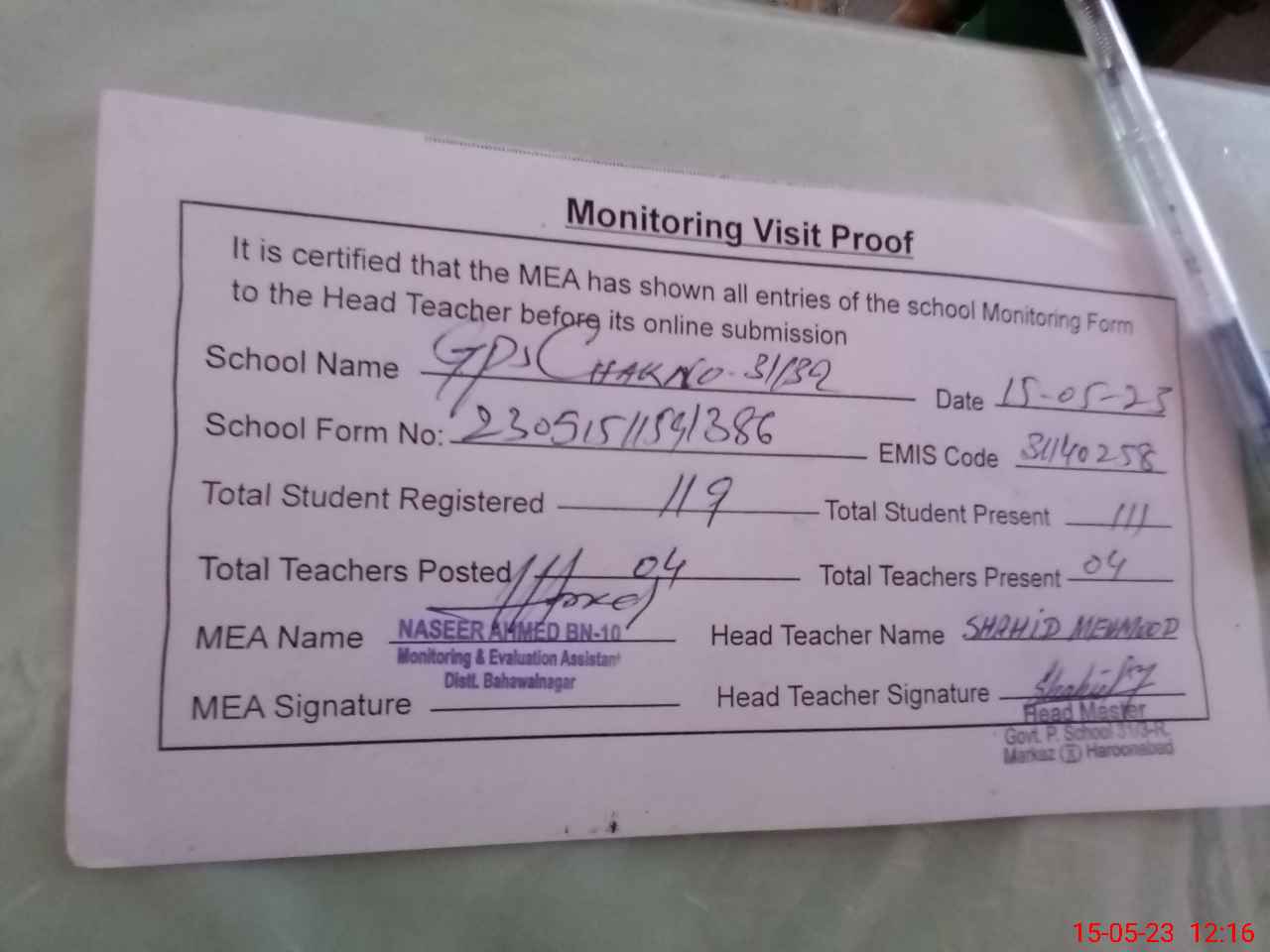 | Attendance Register | Head Teacher | MEA with School | Visit Proof |