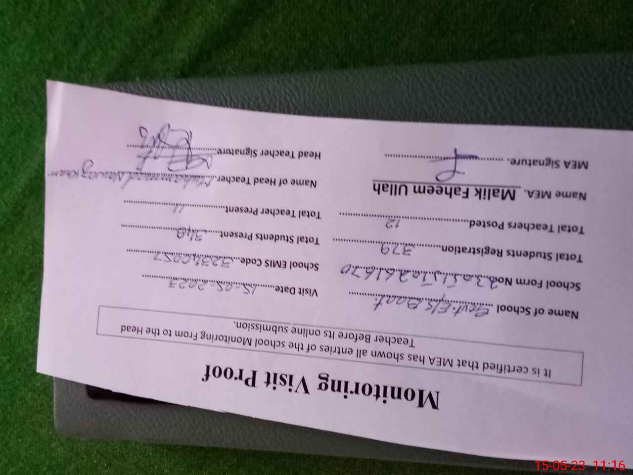 | Attendance Register | Head Teacher | MEA with School | Visit Proof |