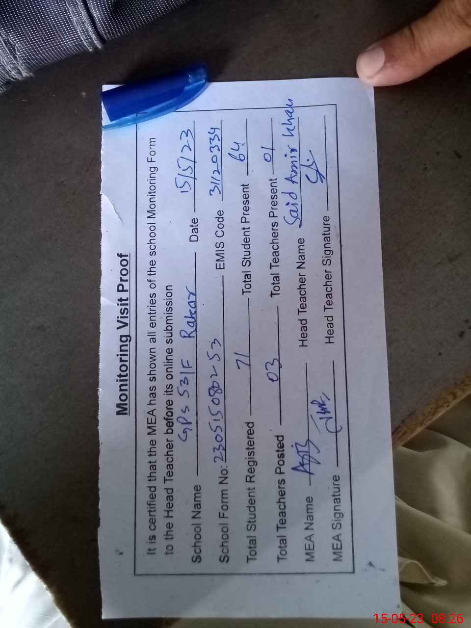 | Attendance Register | Head Teacher | MEA with School | Visit Proof |