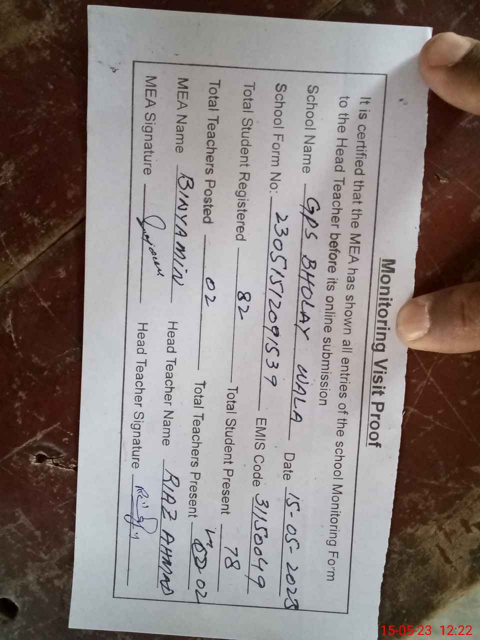 | EMIS Code: 31150049 | Name of School: GPS BHOLEY WALA | |||