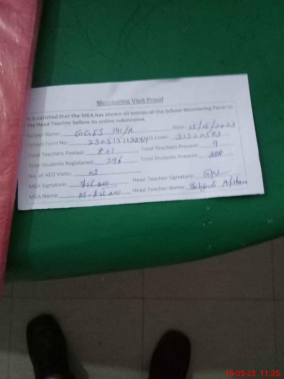 | Attendance Register | Head Teacher | MEA with School | Visit Proof |